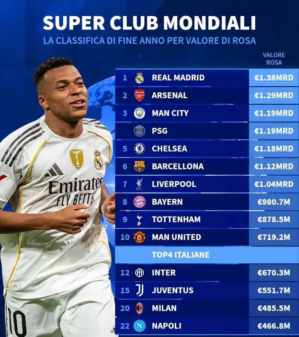 其他传统豪门表现很差。国际米兰和尤文图斯估值分别是6.703亿和5.715亿欧元,排在第12和第15。和过去比,它们的估值降了不少,以前在欧冠赛场上很厉害,现在没那么风光了。那不勒斯只比前面的差一点,掉到了第22位。它不仅被英超中游球队伯恩茅斯超过,还得和非五大联赛的球队竞争。球队因为核心球员价值不稳定,赛场表现也不好,处境很尴尬。
